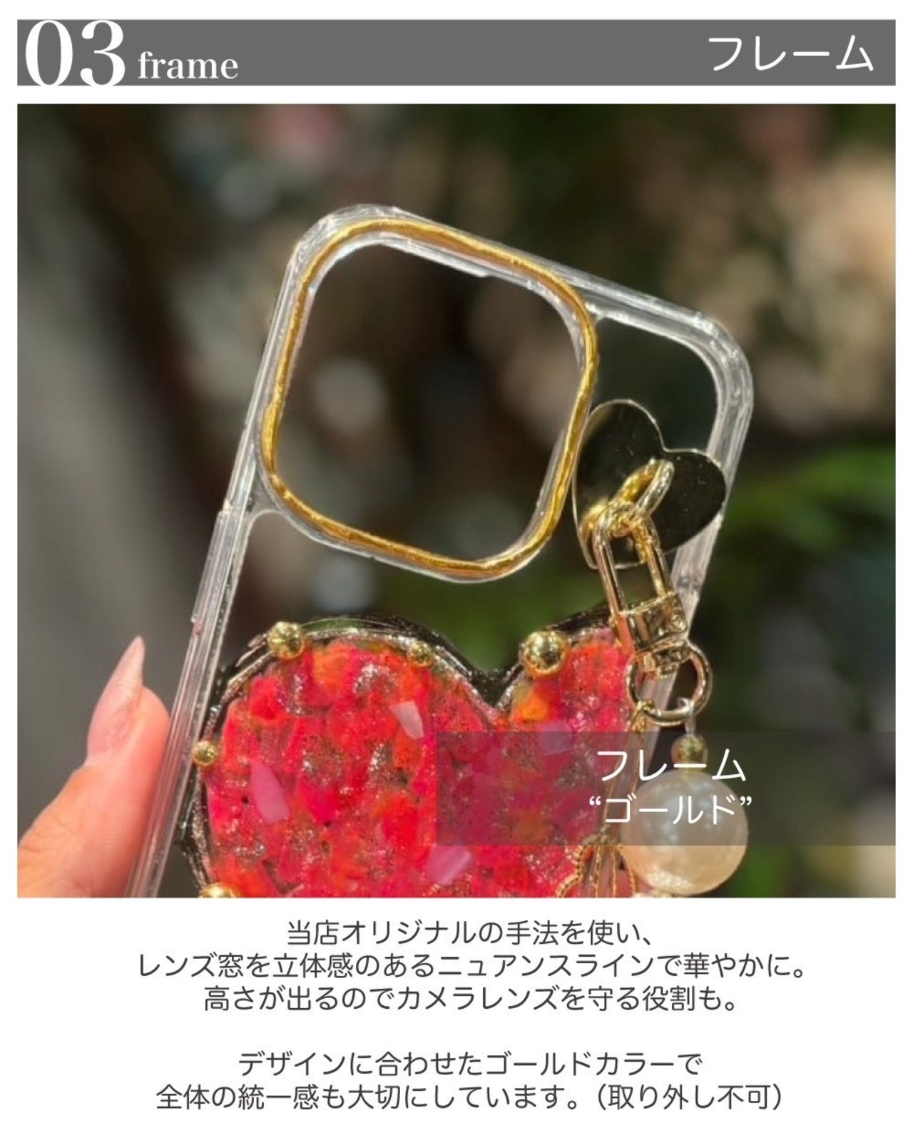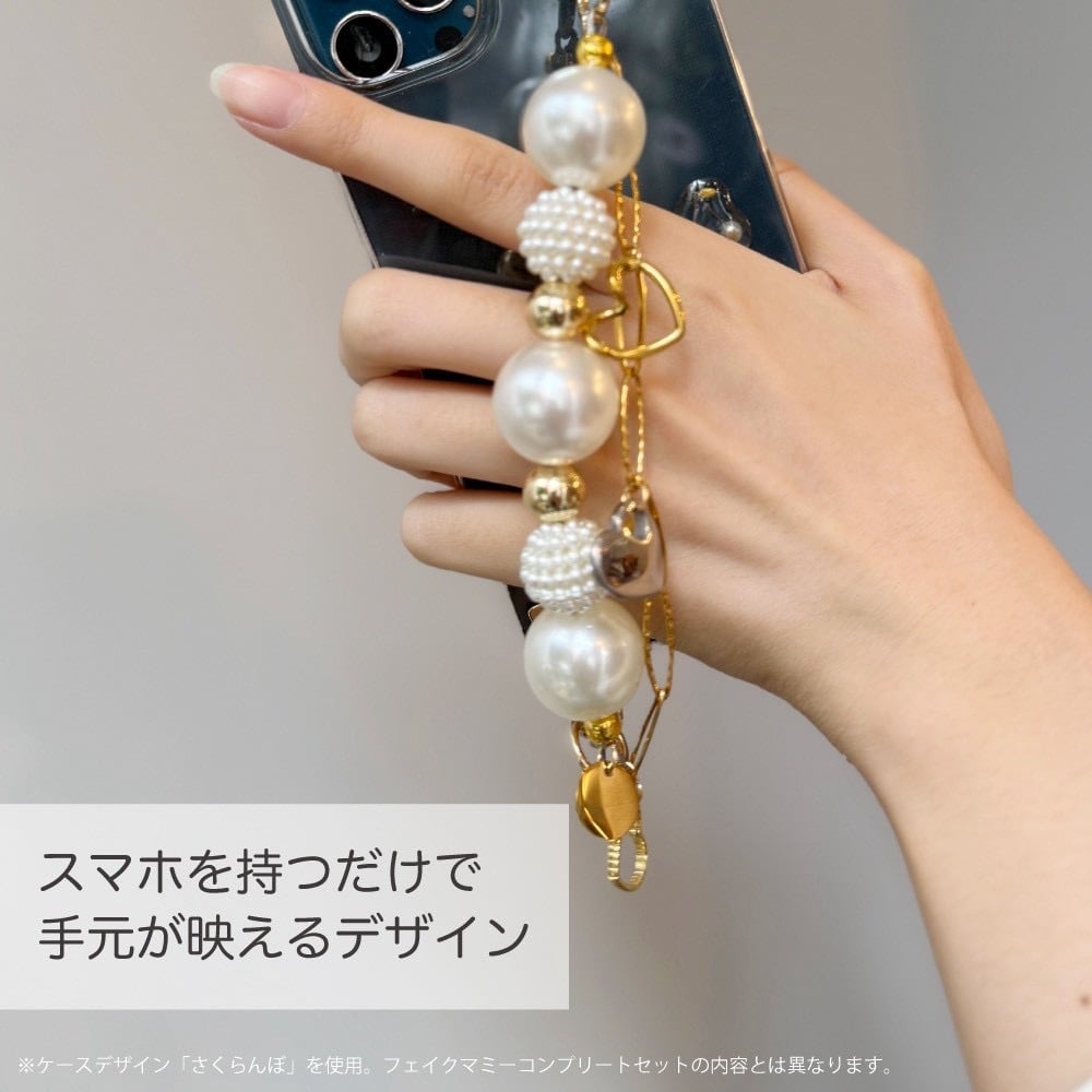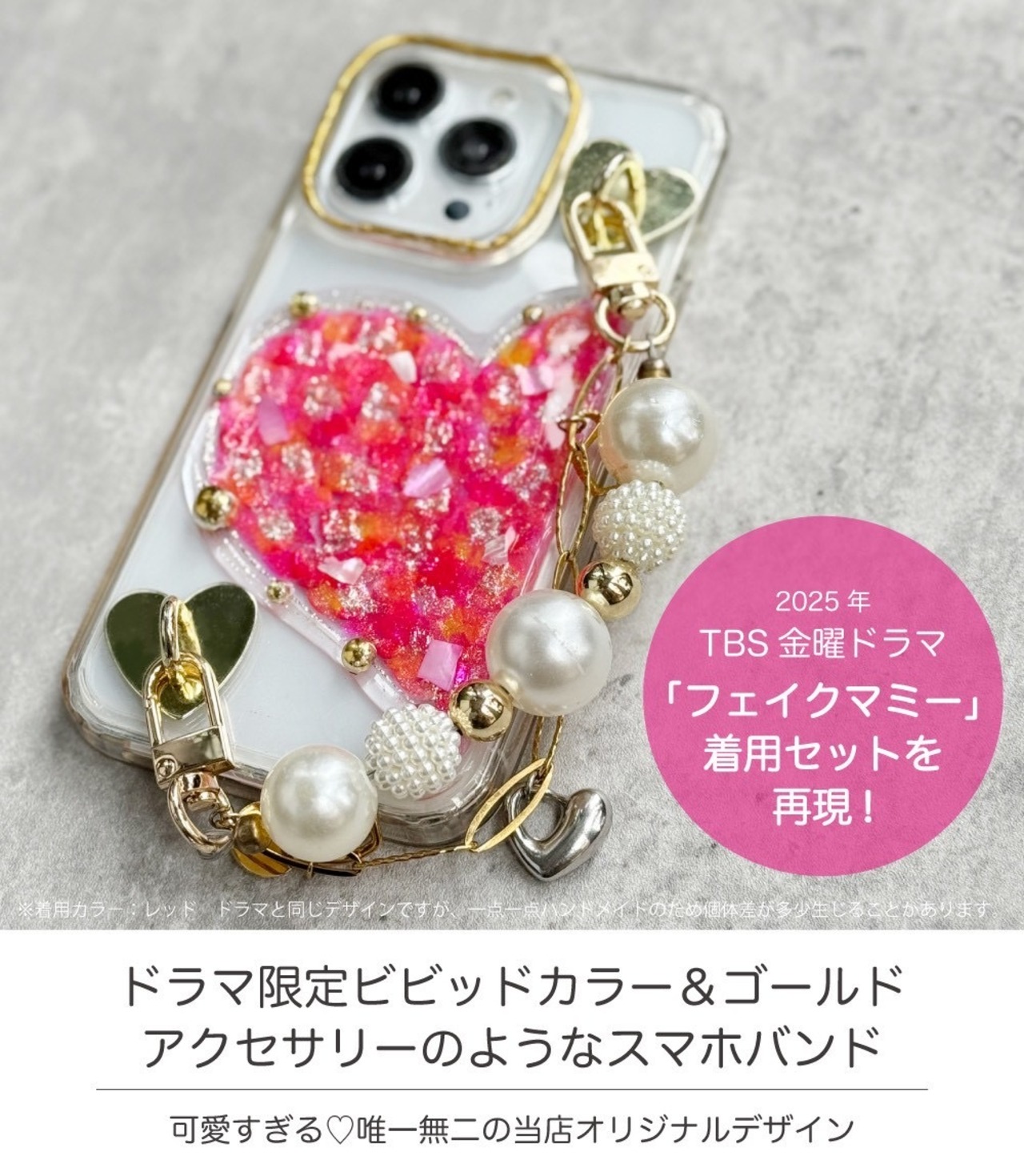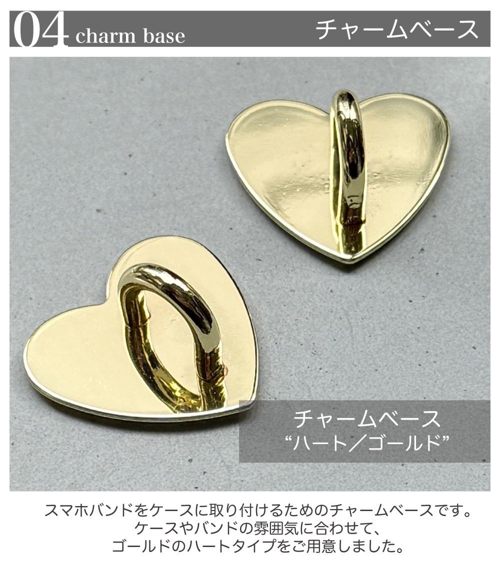ドラマと同様、ハート型チャームベース(ゴールド)+スマホバンド(ゴールド)+カメラフレーム(No8.ゴールド)でお作りしております。