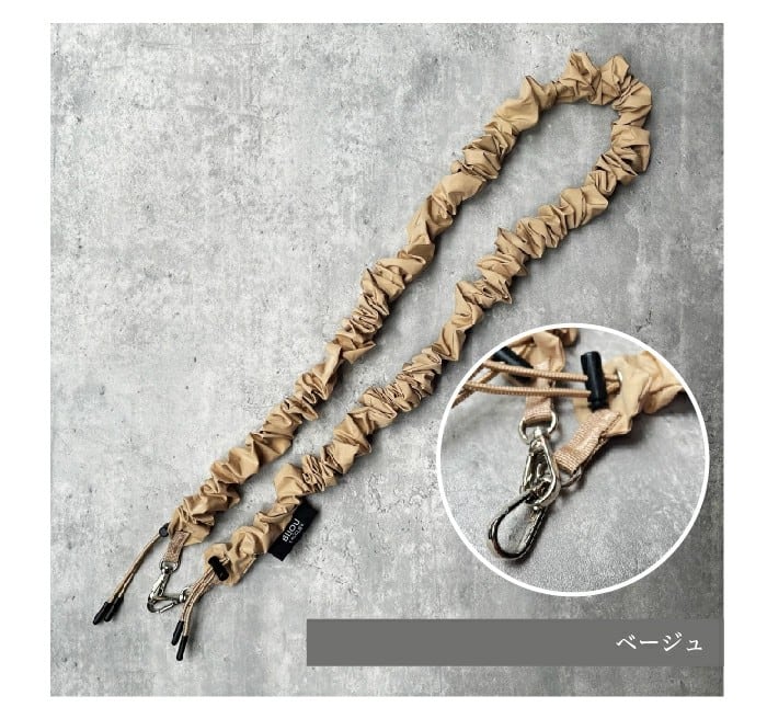 こちらは、軽い素材とゴムを使用した,長さ調節可能なストラップとなっております。